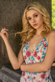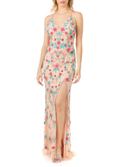 Beautiful Nude long dress with a thigh-high slit in the front and a plunging v neckline. Strappy shoulders with a wide-open back. It is fully embellished all over with multi-color sequins and seed beads. Perfect for a Summer and Spring party, or your prom!