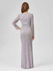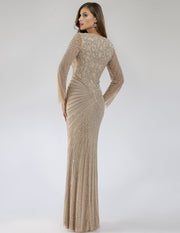 Fitted tulle fabric long sleeves v neckline long dress embellished with seed beads and sequins with beautiful design allover. Wear this to your engagement party, bridal event or a special dinner! You will catch the eyes of everyone there!