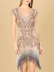 Cap sleeves v neck short dress embellished with beaded fringes on the hem line of the dress. Open back with invisible central zipper. Wear this for a girl's night out, it is perfect for dancing!
