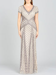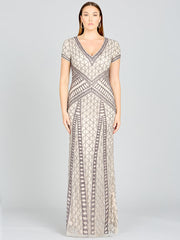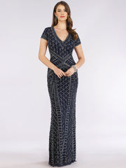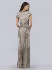 Cap sleeve gown covered in symmetrical beading featuring a v-neckline. Body Fit, Tulle fabric. Available in two colors. This is one of our favorite mother's dress to show curves but still have a modest and elegant.