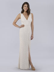 Sleeveless v neck body fitted long gown featuring thigh high front slit and faux wrap skirt covered with seed beads and rhinestones. Has a high back for coverage which also makes it bra friendly.