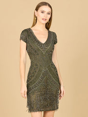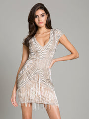 Our best selling short dress! Designed with many occasions in mind such as a bridal shower, rehearsal dinner or a fancy bachelorette night out! Beautiful short dress with fully beaded and rhinestones and fringe on the bottom. Cap sleeves and v neck in a tulle fabric with stretch.