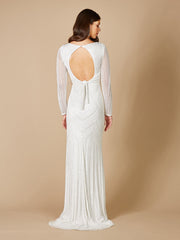 Beaded v-neckline sheath gown. The gown features long sleeves with tie back detail