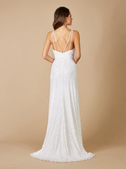 Sequin v-neckline sheath gown. The gown features Sleeveless double strap fitted detail