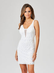 Lara Illusion V-Neck Beaded Mini Dress with Low Back