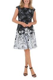 London Times Floral Print Boat Neckline Cap Sleeve Fit and Flare Silhouette Dress