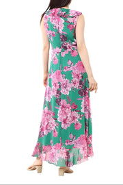 London Times V-Neck Sleeveless Waist Sash Tie Floral Design Ruffle Wrap Midi Dress (Plus Size)