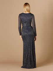 This is a full-length, tulle fabric, long dress with a V neck & long sleeves. It is embellished with seed beads and sequins. Perfect for the guest of a wedding, or a formal dinner.