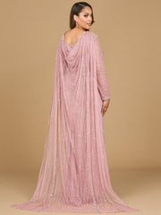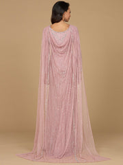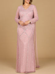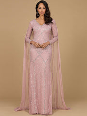 Experience timeless elegance in this flowing cape gown with long sleeves and a chic v-neckline, designed for the modern woman who wants to make a statement. Boasting a high back, form-fitting yet flexible material, and intricate silver and tonal beading, this dress is a true showcase of luxury and style.