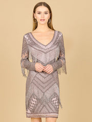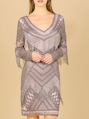 Long Sleeve Beaded V-Neck Fringe Cocktail Mini OUTLET