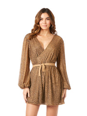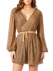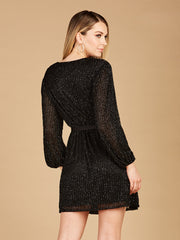 This long-sleeve cocktail dress features a wrap top with a plain belt. A classic style with lots of sparkles! Perfect for a girl's night out!