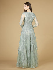 Long sleeve textured lace gown with sparkling stones and embroidery throughout. This gorgeous ballgown offers a modest design and is sure to be the center of attention at your next event. Great for a mother of bride or mother of the groom dress. Something modest yet classy!