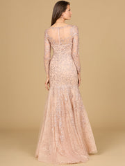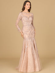 This lovely gown featuring an illusion, sweetheart neckline and long sleeves is an absolute stunner. This dress is finished off with a mermaid bottom and has all over lace appliques. One of our best fitting bodies for a classy look.