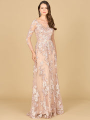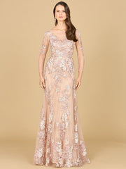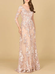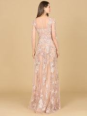 A glittering lace ball gown with long sleeves and an illusion neckline featuring a gorgeous multi-colored lace embroidered pattern and sheer long sleeves. You get the best of both worlds, a dress that covers you, yet compliments your body in the perfect way!