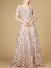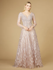 Long sleeve textured lace gown with sparkling stones and embroidery throughout. This gorgeous ballgown offers a modest design and is sure to be the center of attention at your next event. Great for a mother of bride or mother of the groom dress.