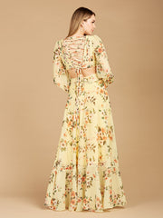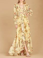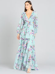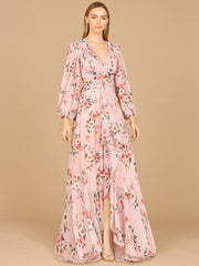 Long Sleeve V-Neck, Layered Skirt Print Dress- OUTLET