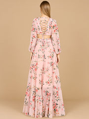 This long sleeve V-neck print dress has cut outs on the waist line to really give you a slimming look. This beautiful print with long sleeves features a lace up back. You'll have everyone's attention in this unique one of a kind piece!