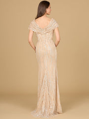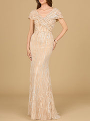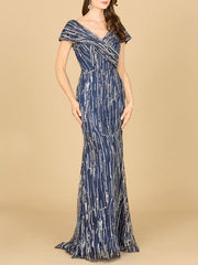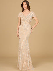 This lovely gown featuring a v-neckline with overlapping cap sleeves that can be worn off shoulder. This dress is finished off with a mermaid bottom. One of our best fitting bodies for a classy mother look.