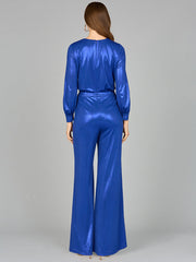 Spectacular shimmering jumpsuit in a stretch knit jersey fabric that fits like a glove. Features long sleeves and flowing pant legs with a v-neckline.