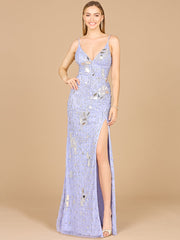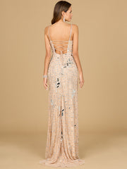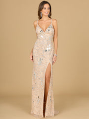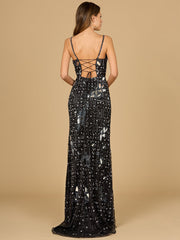 Sparkling, mirror beaded gown with spaghetti straps has a high slit and lace up back. Add a bit of extra dazzle to any affair with this stunning beaded gown. Whether you're prom ready or cocktail chic, you're sure to be the showstopper!!