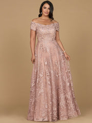 Off Shoulder high neckline, A-line lace gown enveloped in exquisite lace appliqué and glittering rhinestones, creating a sophisticated and luxe look.