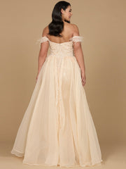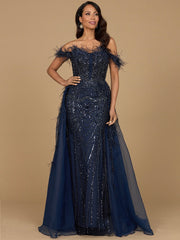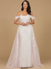 Look like a glittering dream in our Off Shoulder Gown with Feathers. The fitted silhouette with overskirt is crafted with rhinestones and beads, while the neckline is elevated with delicate feathers, creating an elegant, show-stopping design. Embrace the sophistication and royalty of this one-of-a-kind style.