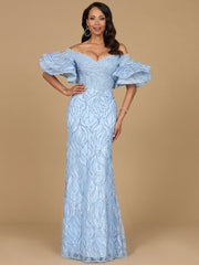 One of the best selling Lara New York gowns! Beautiful mermaid gown with off shoulder sleeves featuring a unique tiered cape sleeve. This versatile gown accentuates your curves gracefully and is suitable for any member of the bridal party, from the mother of the bride to a sister of the groom.