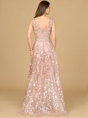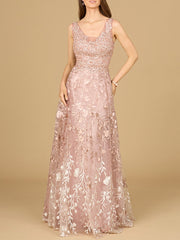 Gorgeous floral pattern ball gown with a showcasing v-neckline. This gorgeous ballgown features a ombre effect to the hem that is sure to make you center of attention at your next event. Great for a mother of bride or mother of the groom dress.