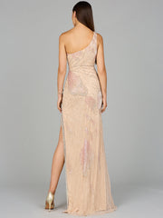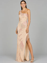 This sultry, sparkly look features a one-shoulder neckline, a silhouette designed to turn heads, and twinkling beaded fringes. Perfect for those who demand an alluring, beaded pattern and a thigh high slit.