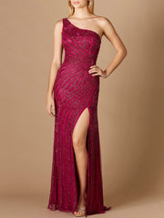 This is a one-shoulder beaded dress with a high slit and low back. It is a perfectly dramatic style for a red carpet look or a classy date night!