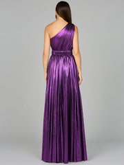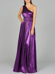 Radiate in this jersey metallic dress with one shoulder ruched bodice. Features a pleated skirt for an elegant and classy look perfect for a wedding guest dress or a fancy night out.