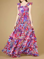 This is a high neck print dress with ruffles in a red/purple based floral pattern. This beautiful print combined with the ruffled skirt that's ideal for a daytime event. It's attention-grabbing and made for the sun.