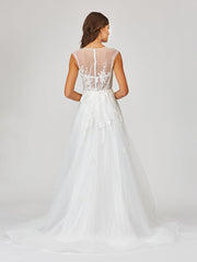 Beautiful bridal gown with all over embellished lace over a sheer bodice with delicate boning and an illusion neckline featuring a sweep train.