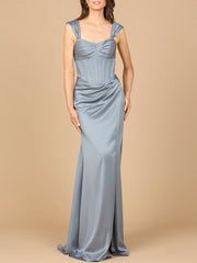 Experience the perfect blend of sophistication and playfulness with this stunning satin backed gown featuring a sheath dress and corset bodice. Made from sumptuous satin backed crepe fabric, it offers both comfort and luxury.