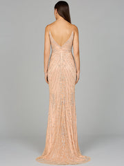 Sleeveless beaded gown with a showcasing v-neckline fitted through hips cascading into a flowing sweep train. The beaded pattern comes in at the waist and.