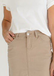 The Stella Simply Taupe Denim Maxi Skirt is the ultimate blend of classic modest style and everyday comfort! An Inherit Design and a customer favorite, this modest maxi skirt is crafted for timeless wear. The structured denim fabric gives it a polished, put-together look, while the straight-fit silhouette ensures versatility for any occasion. Thoughtfully detailed, it features a silver button closure with the Inherit Badge Logo, functional pockets, and belt loops for added style options. The 14-inch back slit provides ease of movement, making it effortless to wear all day. Whether styled casually with a simple tee and sneakers or dressed up with a blouse and boots, this denim maxi skirt is a wardrobe staple you'll reach for again and again. Perfect for work, weekends, and everything in between, the Stella is a must-have for any modest fashion lover looking for a go-to denim piece that never goes out of style!