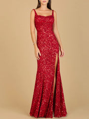 This sleeveless beaded dress has a high slit and a mid back. Perfect for a wedding guest or a fancy date night gown!