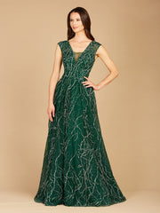 Elegant sleeveless plunging v neckline ball gown. Features a gorgeous embroidered pattern with all over beads. Wear this to your engagement party, with its plunging neckline and elegant style, you'll be the talk of the town!