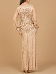 Experience the elegance and sophistication of the V Neck Beaded Long Sleeve Dress. Crafted in a modest, glittering cut with sparkling beads and fabric, this dress features a unique v-neckline that offers a flattering coverage. Ideal for the mother of the bride, this Lara gown adds a touch of exclusivity to elevate your special occasion look.