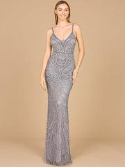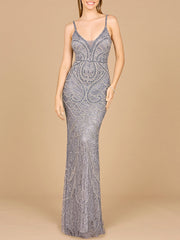 Gorgeous beaded patterns in this spaghetti strap, v-neck gown. A perfect dress for any fancy night out!
