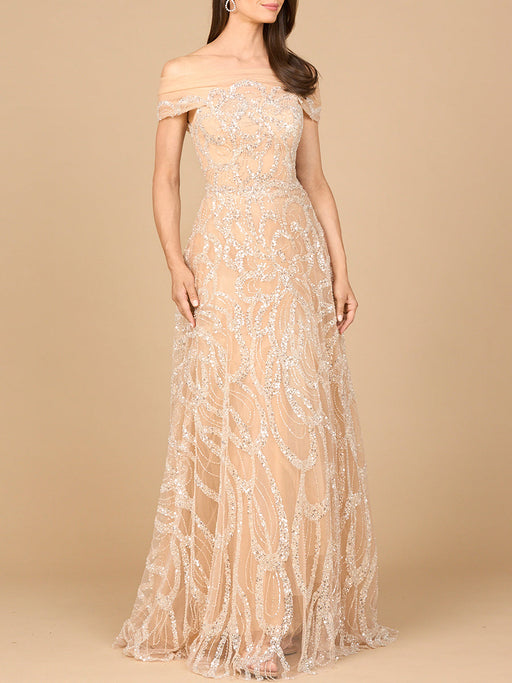 View full detailsCapture eyes in this stunning A-line gown with delicate off-the-shoulder sleeves. The intricate beading on the bodice and refined design elevate th...