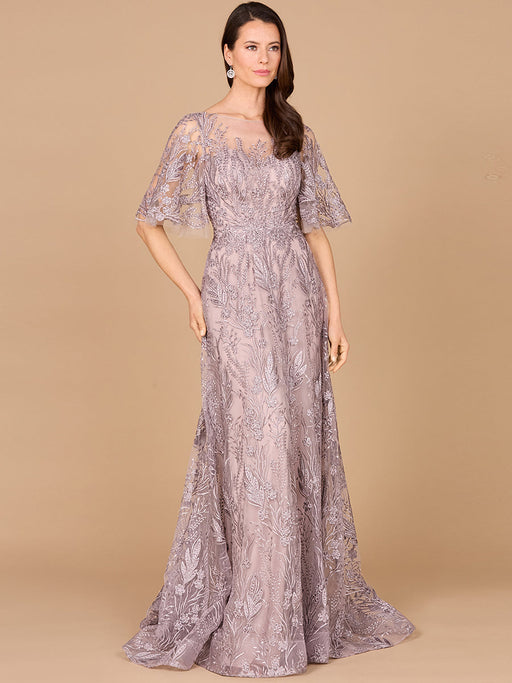 View full detailsGlittering lace ballgown with an illusion neckline and flowing cape sleeves. This gown features an embellished bodice and modest coverage, perfect ...