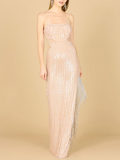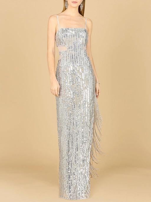 View full detailsIntroducing our new brand, Friday the 18th! This sexy V-neck dress with beaded fringe and sequins all over features a circular mesh lined cutouts a...