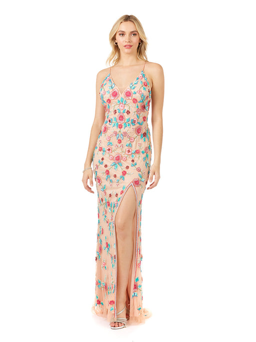 View full detailsBeautiful Nude long dress with a thigh-high slit in the front and a plunging v neckline. Strappy shoulders with a wide-open back. It is fully embel...