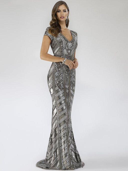 View full detailsSequins geometrical pattern design allover long dress. Also embellished with rhinestones and seed beads. It has cap sleeves, v neck made of tulle f...