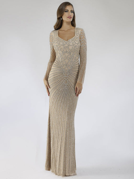 View full detailsFitted long dress with long sleeves and v neckline. Fully embellished with seed beads and sequins on a stretchable tulle fabric. This is perfect t...