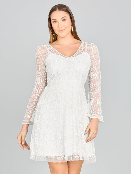 View full detailsBeautiful, classy long bell sleeve short dress. Fully embellished with seed beads. Product Details Back zip Beaded polyester tulle on polyester l...