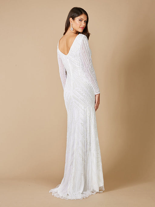 View full detailsBeaded sheath gown with long sheer sleeves and a v-neckline. Fully embroidered with ombre beads on a dusty purple lace. Perfect for the guest of a ...