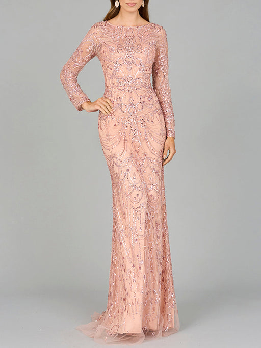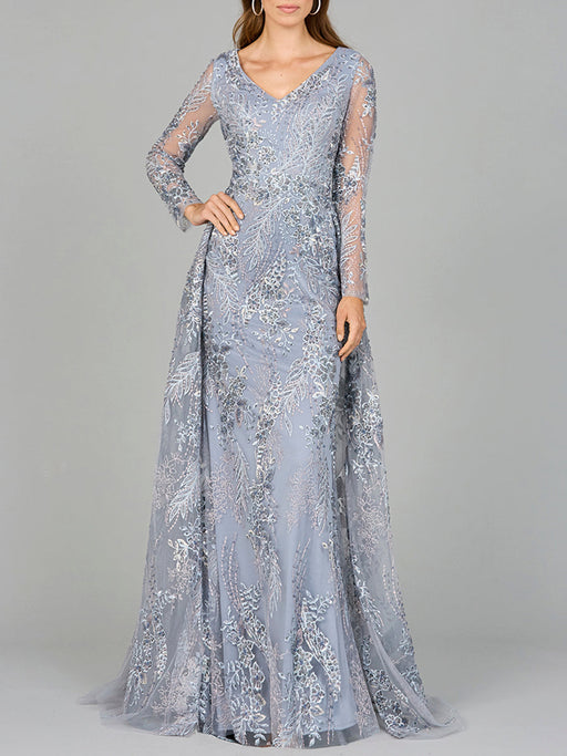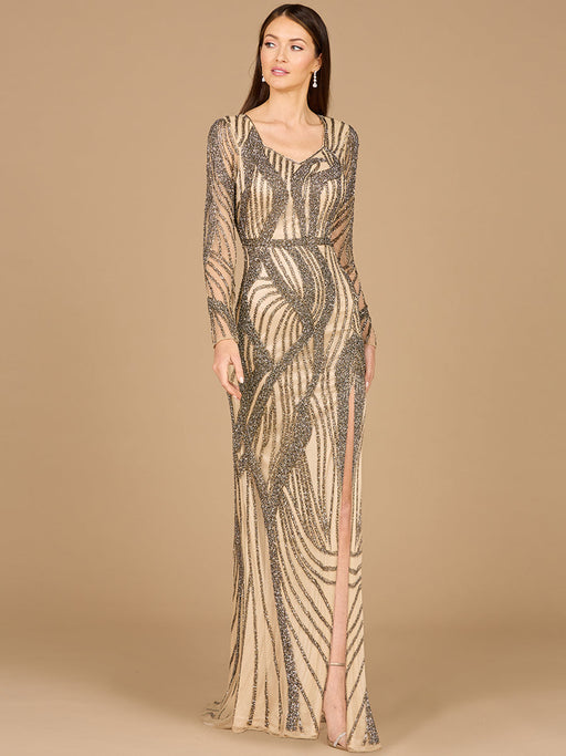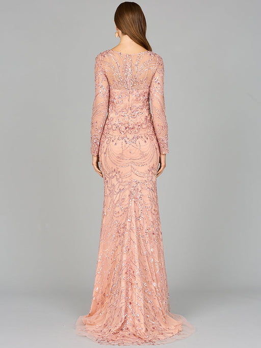 View full detailsBeaded v-neckline sheath gown. The gown features long sleeves with tie back detail Product Details Style# 51088 Back zipper Beaded tulle on stret...