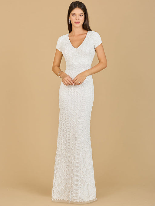 View full detailsCap sleeve gown covered in symmetrical beading featuring a v-neckline. The tulle fabric has lots of stretch to fit your curves perfectly. Available...